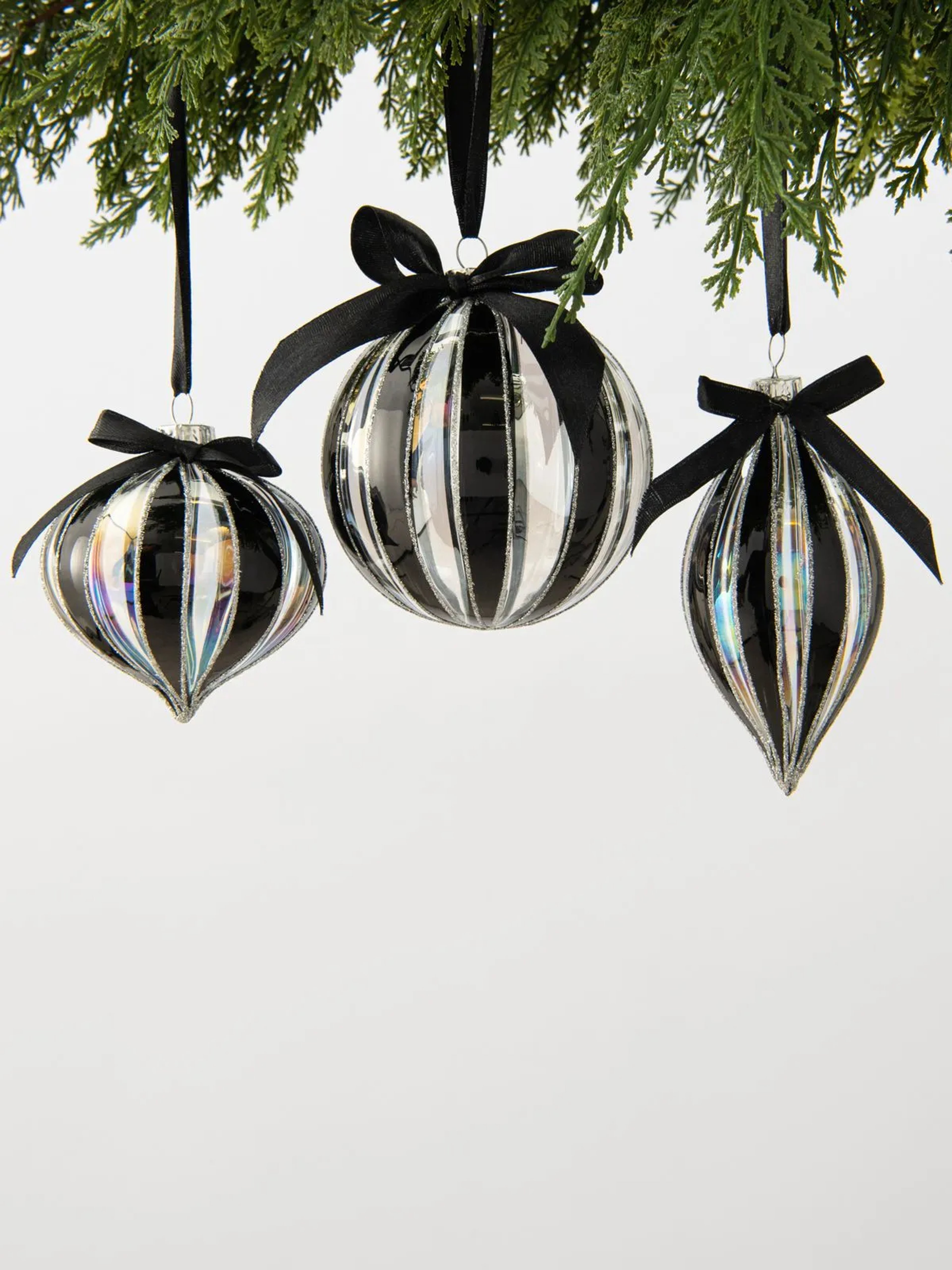 Striking and festive, our Striped Ribbon Glass Baubles elevate your tree decor with classic stripes, luxe glitter, and elegant satin ribbon details. Delicate and timeless, when hung with care and lovingly stored, glass decorations can last for generations and become future family heirlooms.