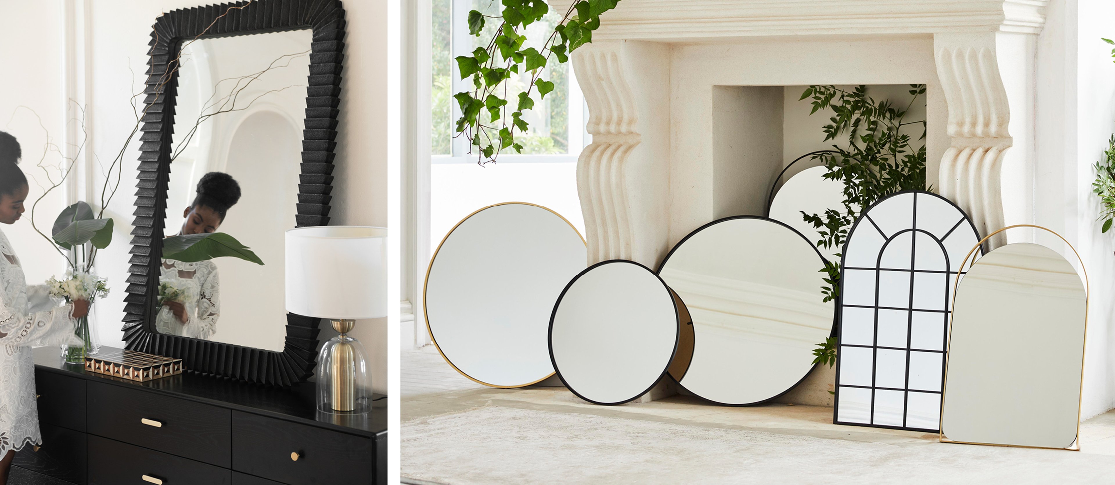 Styling tip: An opulent framed mirror turns the piece from practical to a work of art. Consider a frame that elevates the room it hangs in like the striking Peruvian mirror or Sunburst mirror.