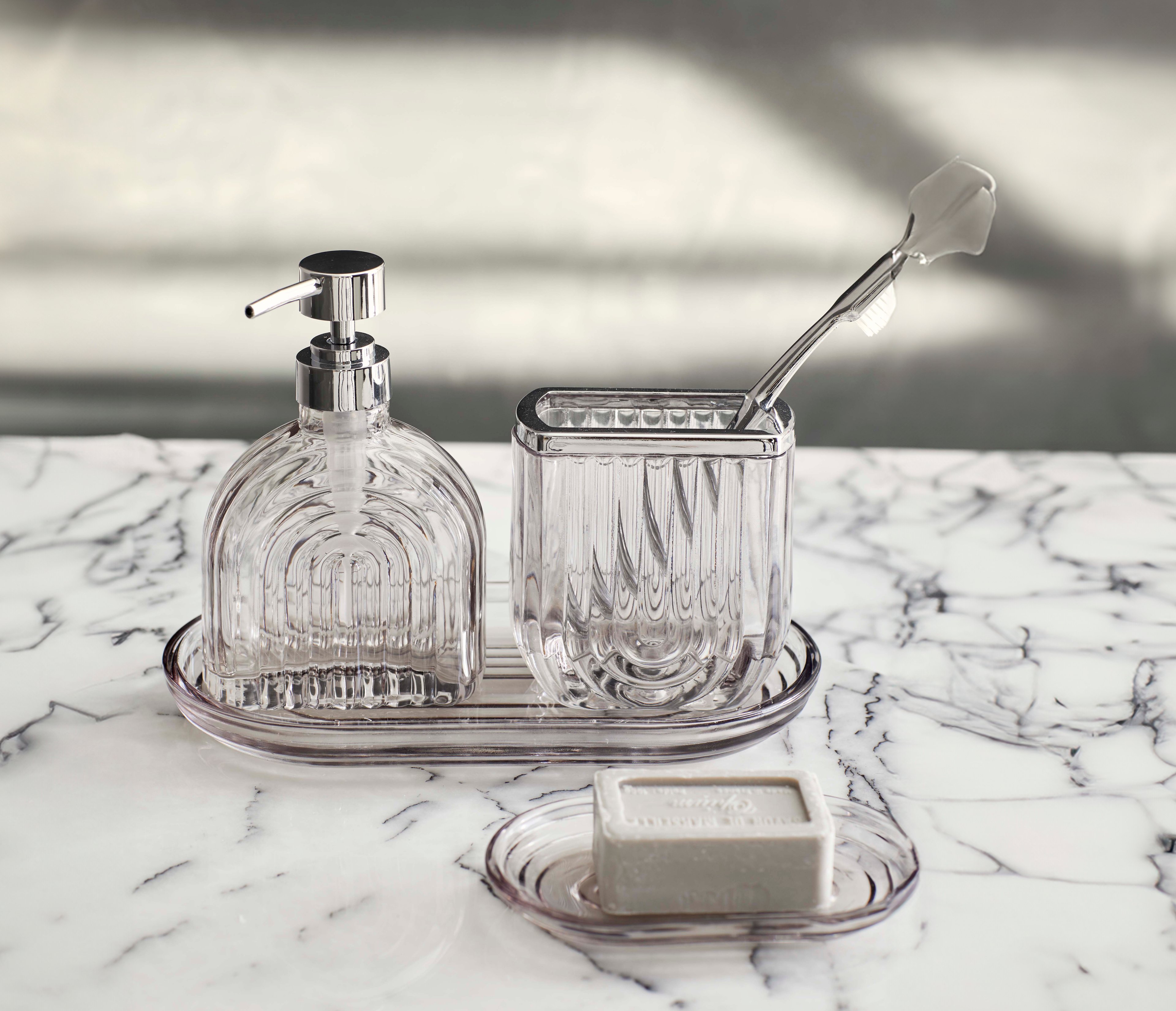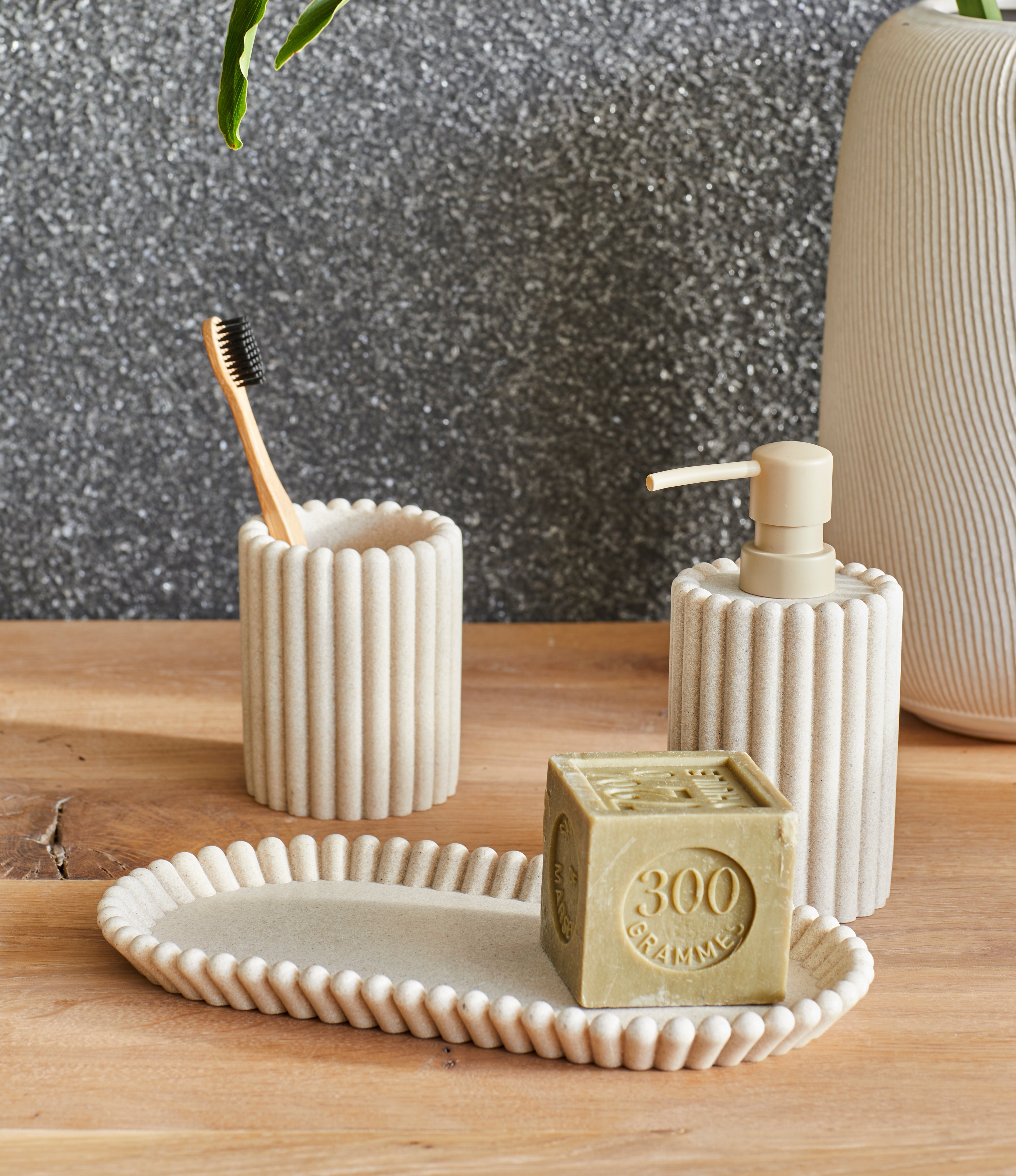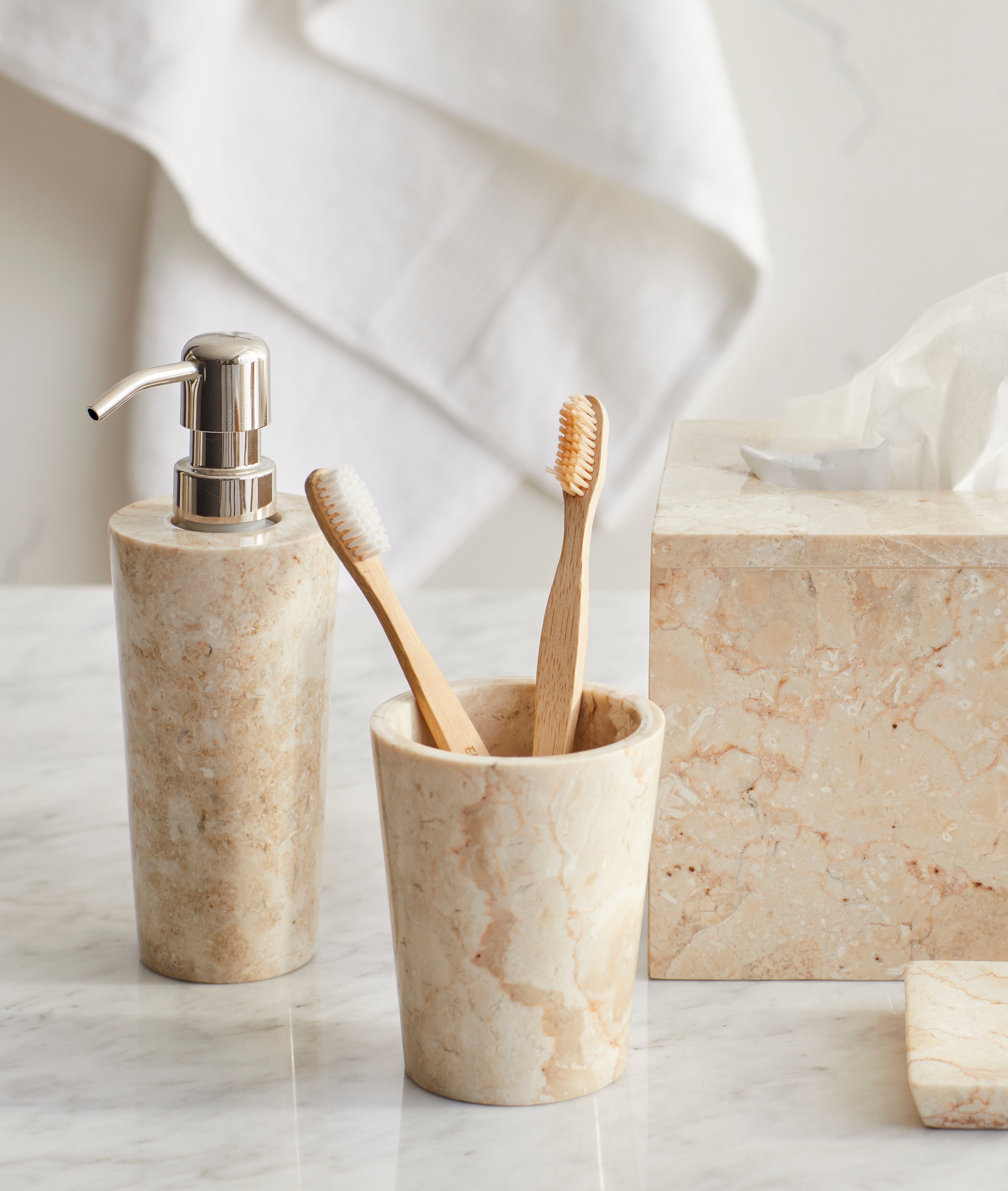 - Choose matching sets for little details: many homeware stores offer matching bathroom sets. If you have 2 bathrooms, purchase 2 mismatched but complementary sets to create some interest for example pairing marble and glass:a marble soap dish or a glass perfume bottle