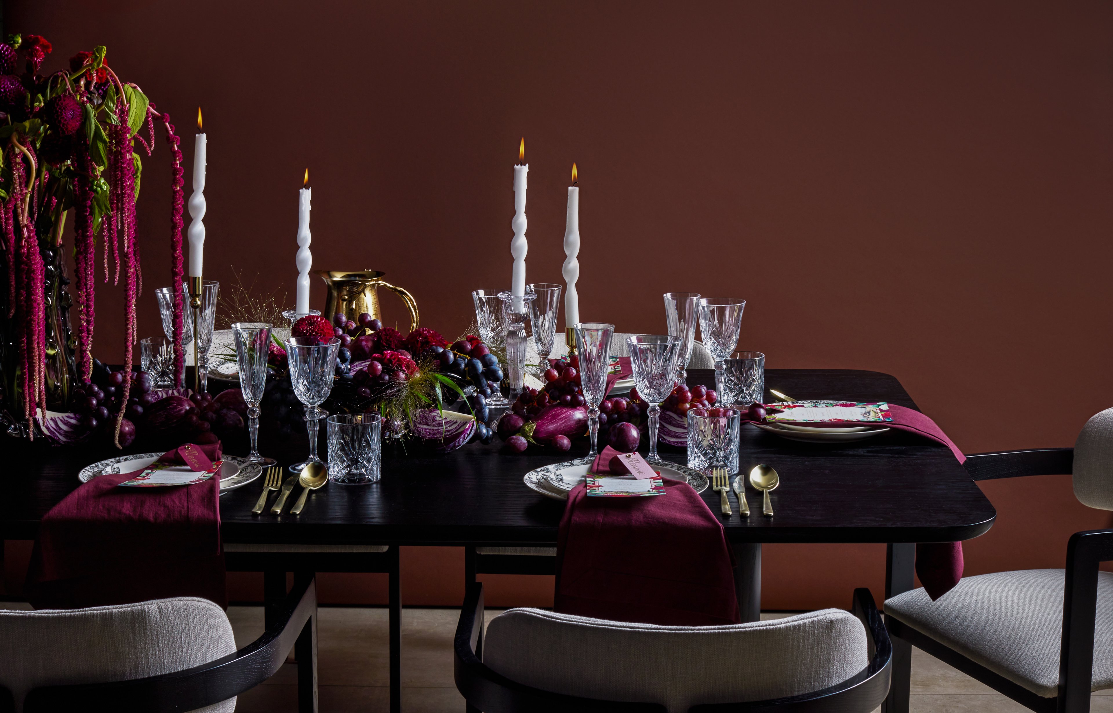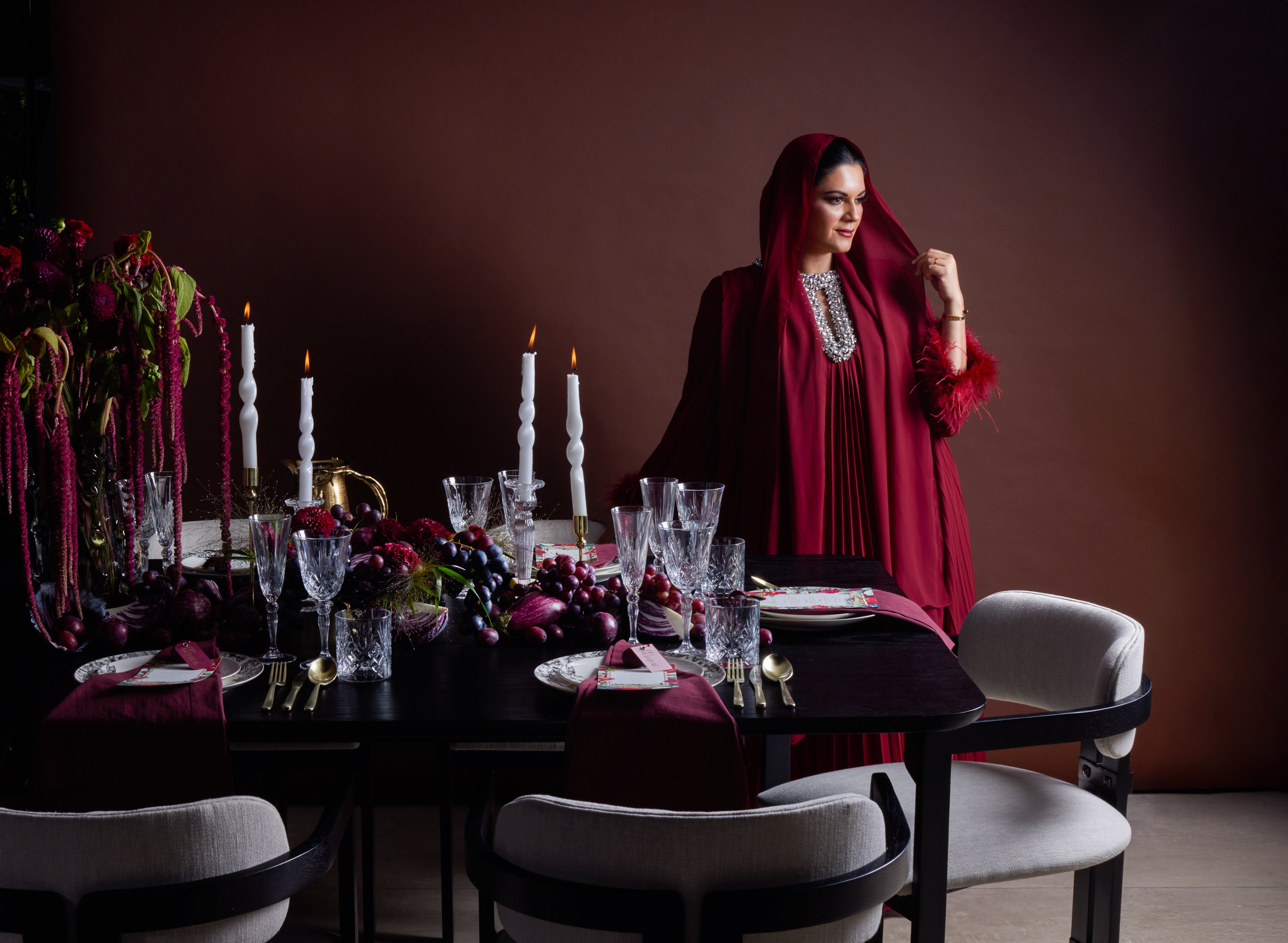 Setting the tone for your Eid meal begins with an exquisite tablescape. This Eid, I’m embracing deep jewel tones. Think fuchsia, aubergine, and fig—to create a rich and inviting atmosphere. These vibrant hues flow effortlessly down the center of my table, complemented by simple blooms, which add a touch of organic elegance.
