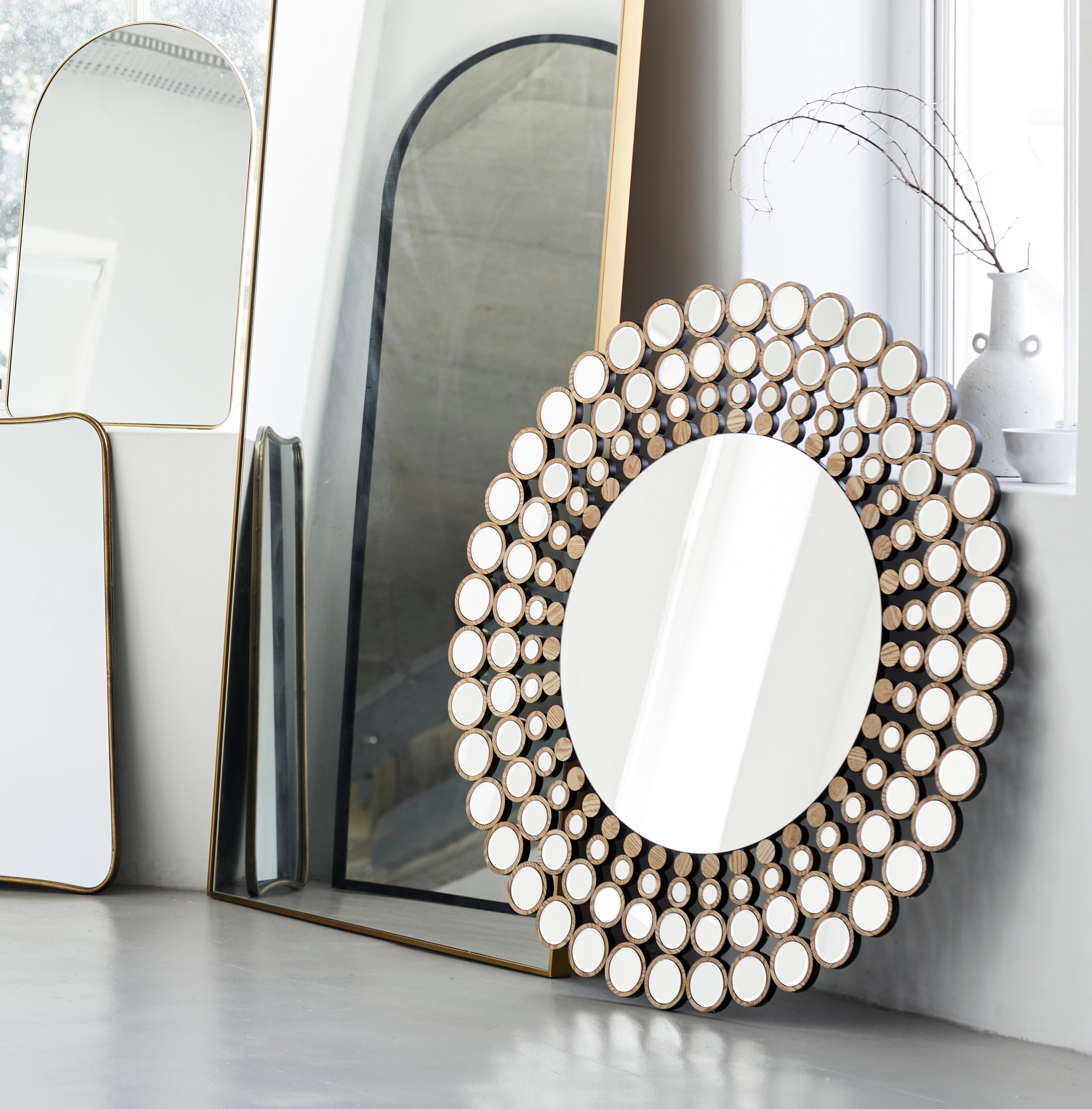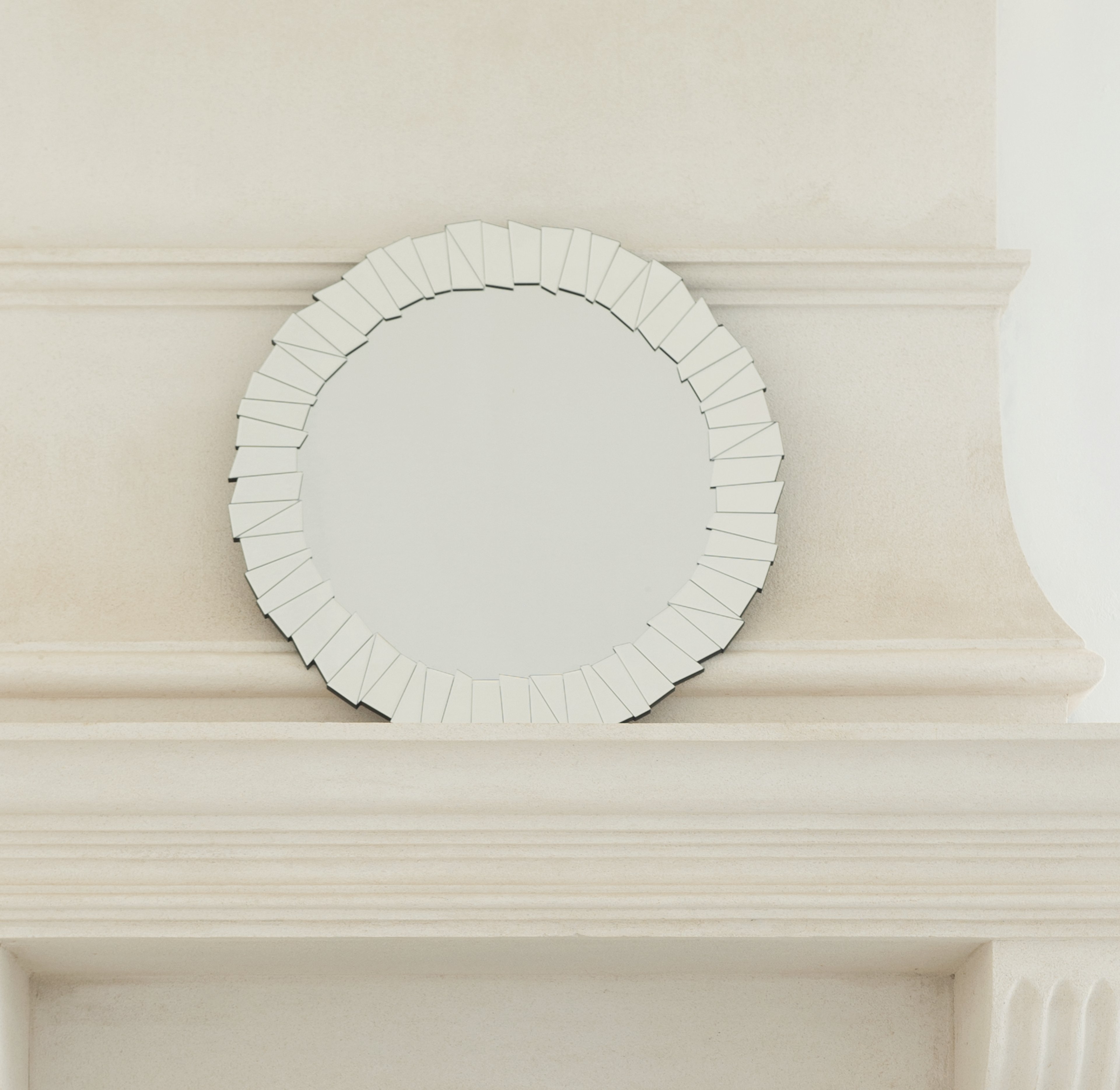 This round mirror is surrounded by irregular shape mirror pieces that reflect the light and give it an interesting decorative quality.
