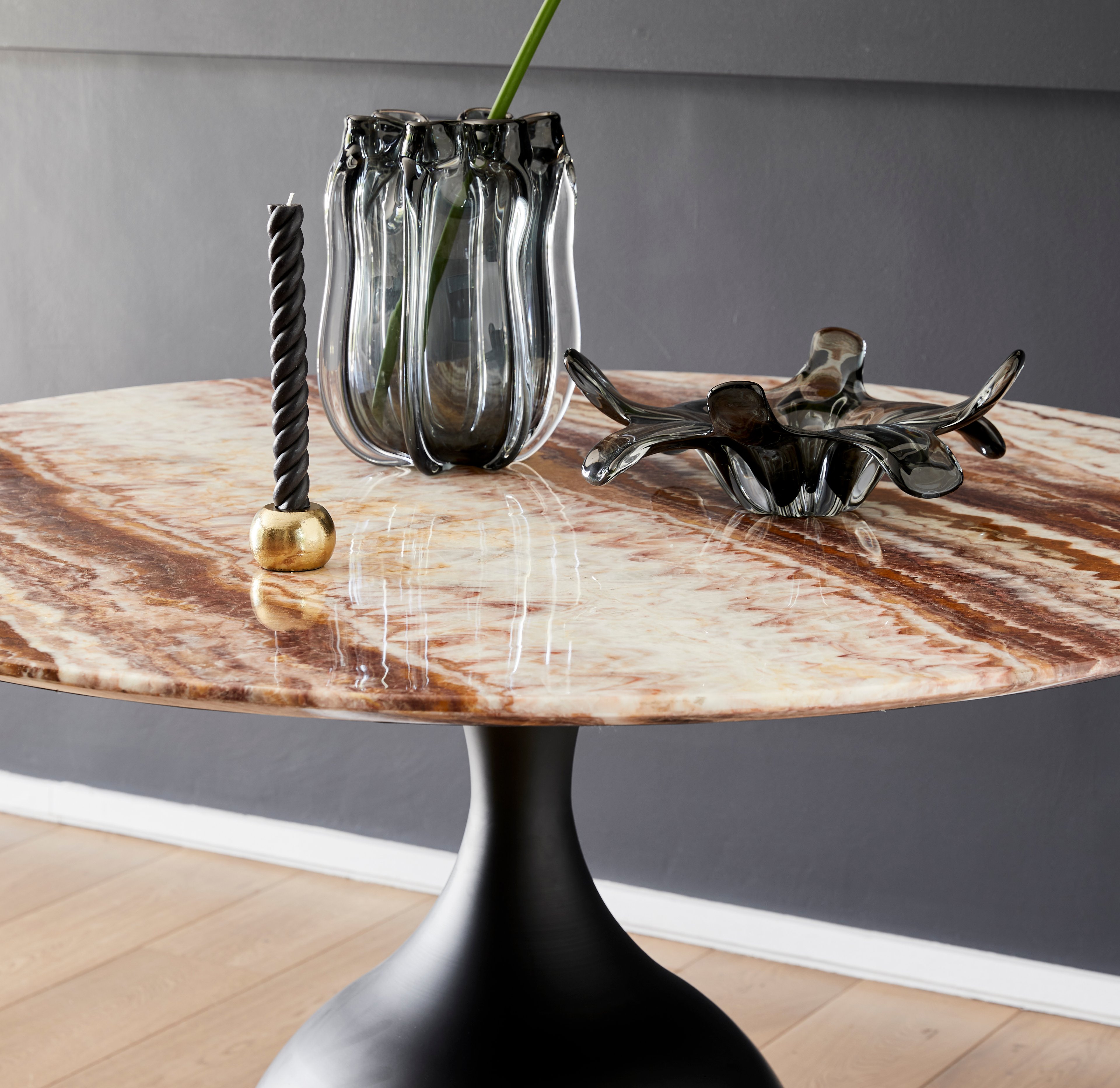 Introducing the Bulb Dining Table in a vibrant red color marble top and a round shape. Perfect addition to brighten up your dining area with this stylish and piece.
