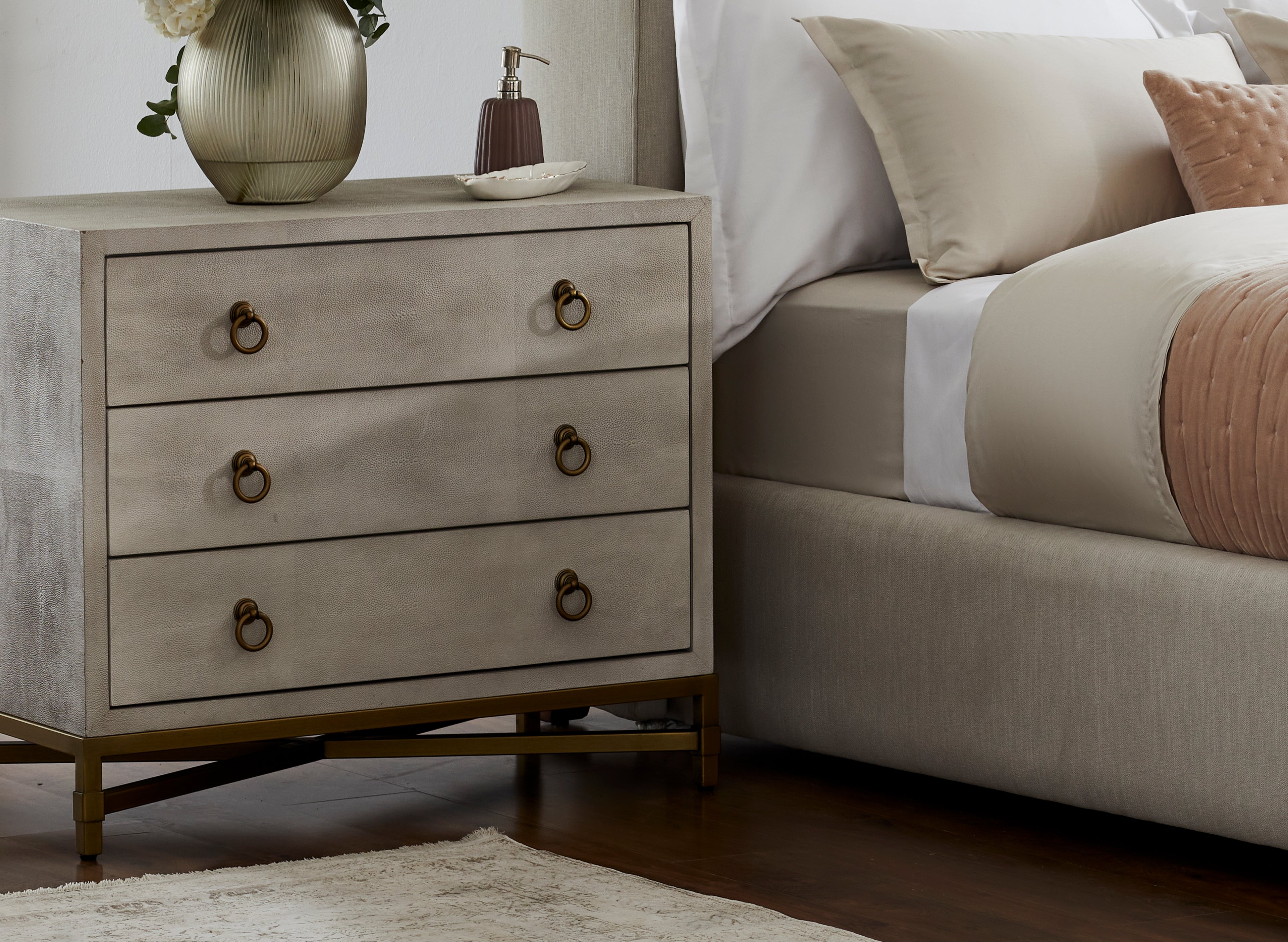 Shagreen: is prized for its unique, pebbled surface and subtle sheen. As a design material, it exudes elegance and sophistication, adding an exotic yet refined touch to furniture and décor. Available in an array of shades, it is often seen as a treatment in place of veneer or even leather, giving furniture pieces and opulent look and feel.