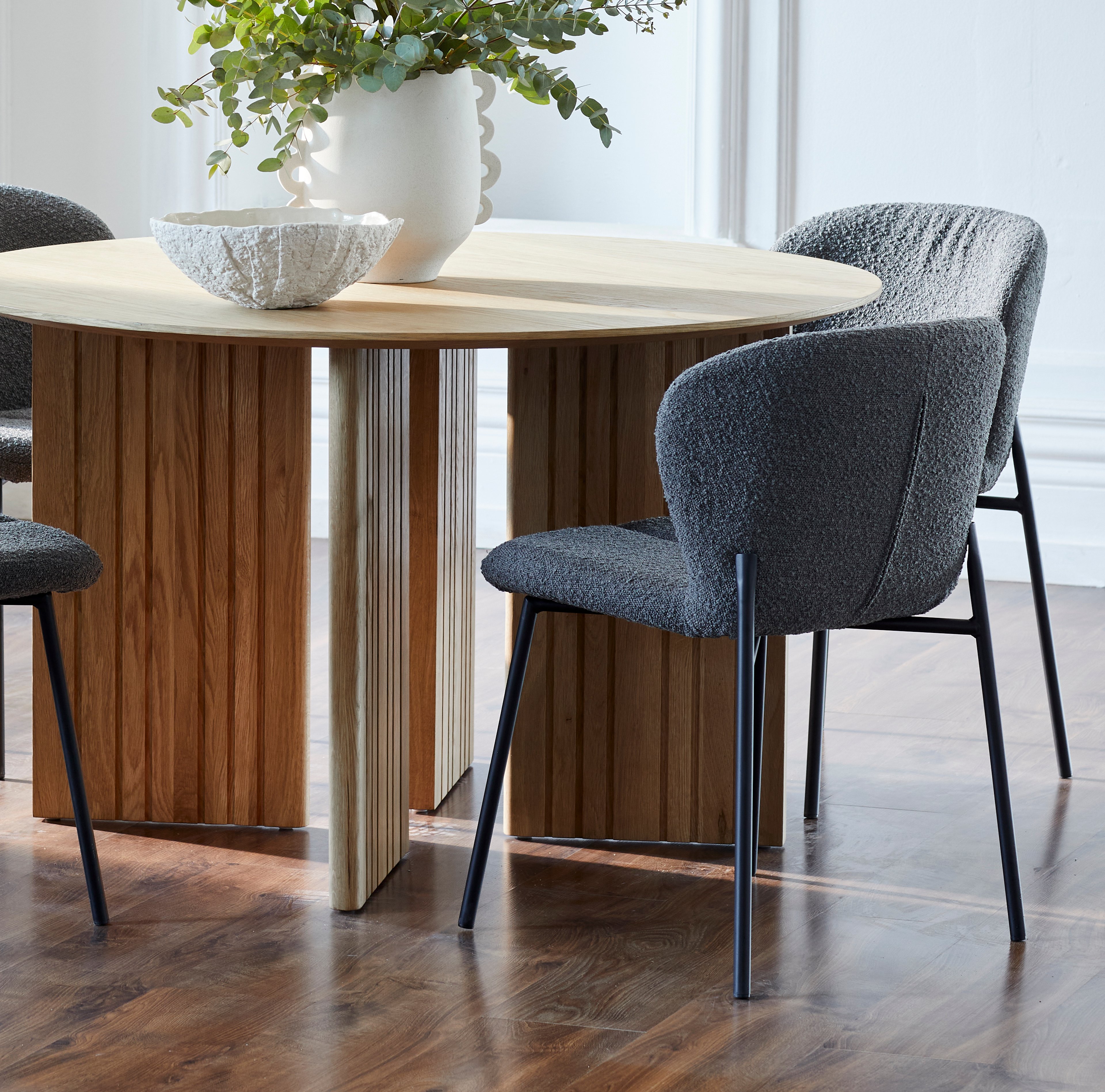 Use bouclé in accent pieces like armchairs, ottomans, dining chairs or a large statement sofa.