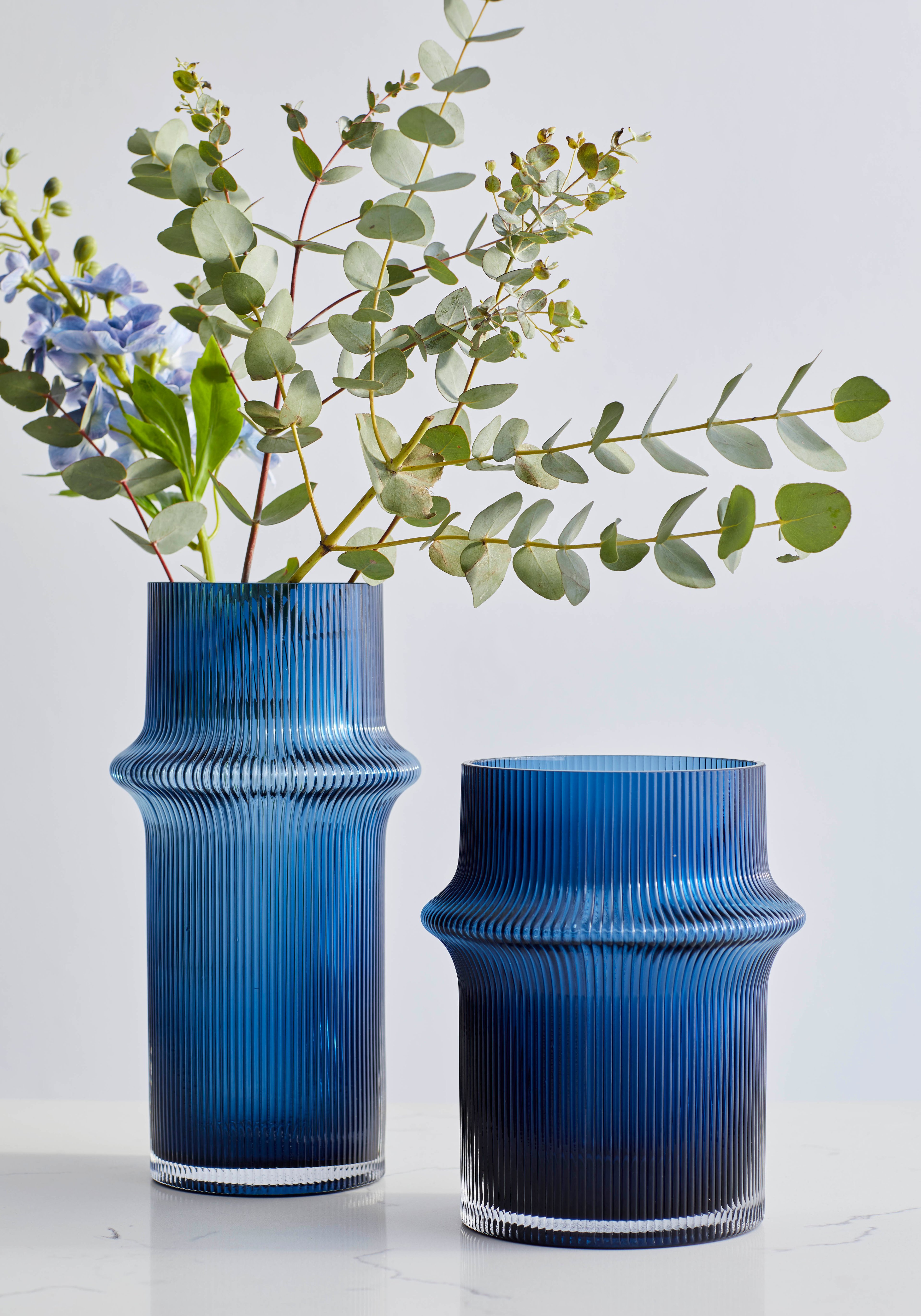 Display fresh blooms or greenery in this beautiful blue glass vase with fluted detail and an interesting pinched shape. Combine it with different sizes in the same style for a layered look.