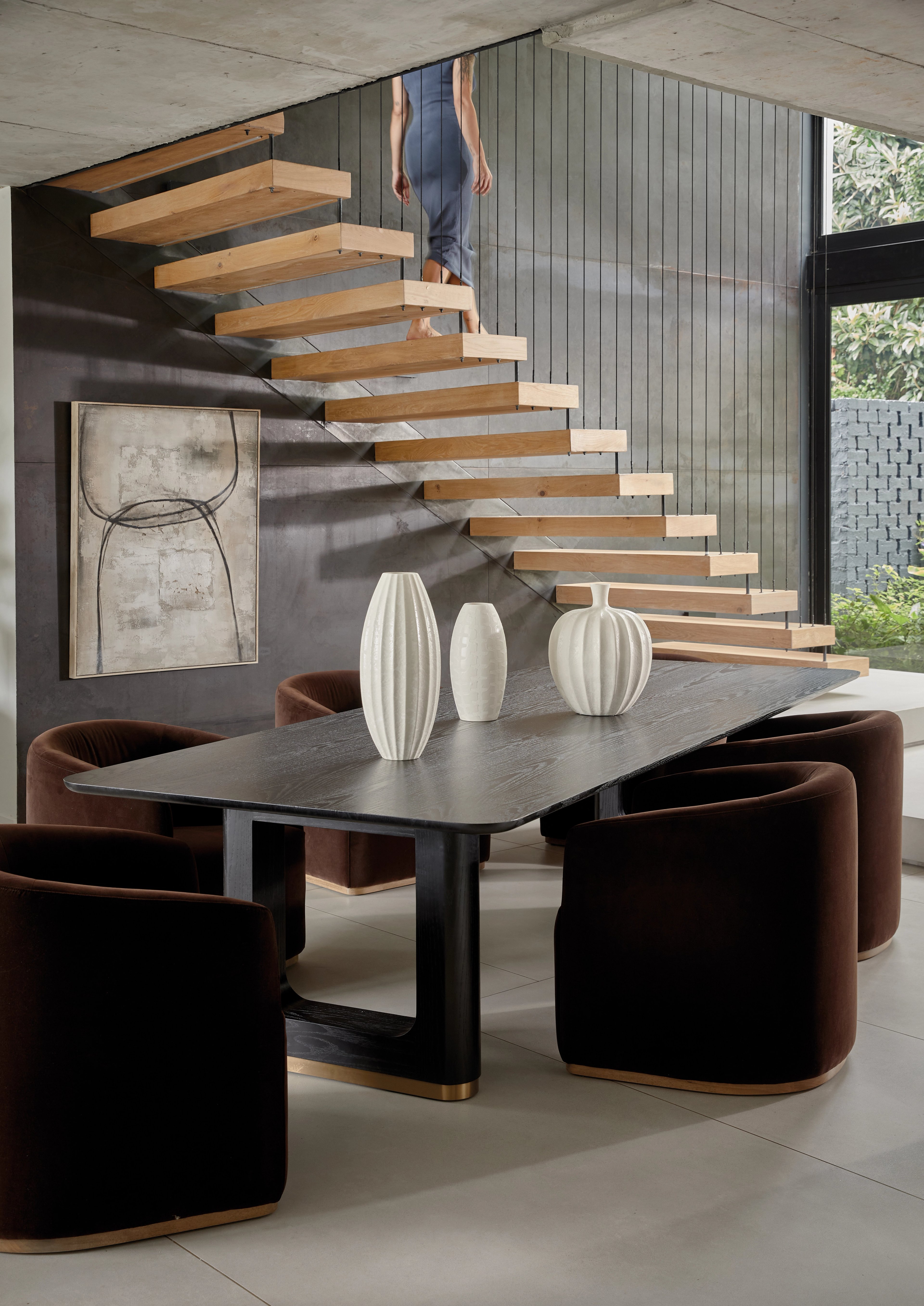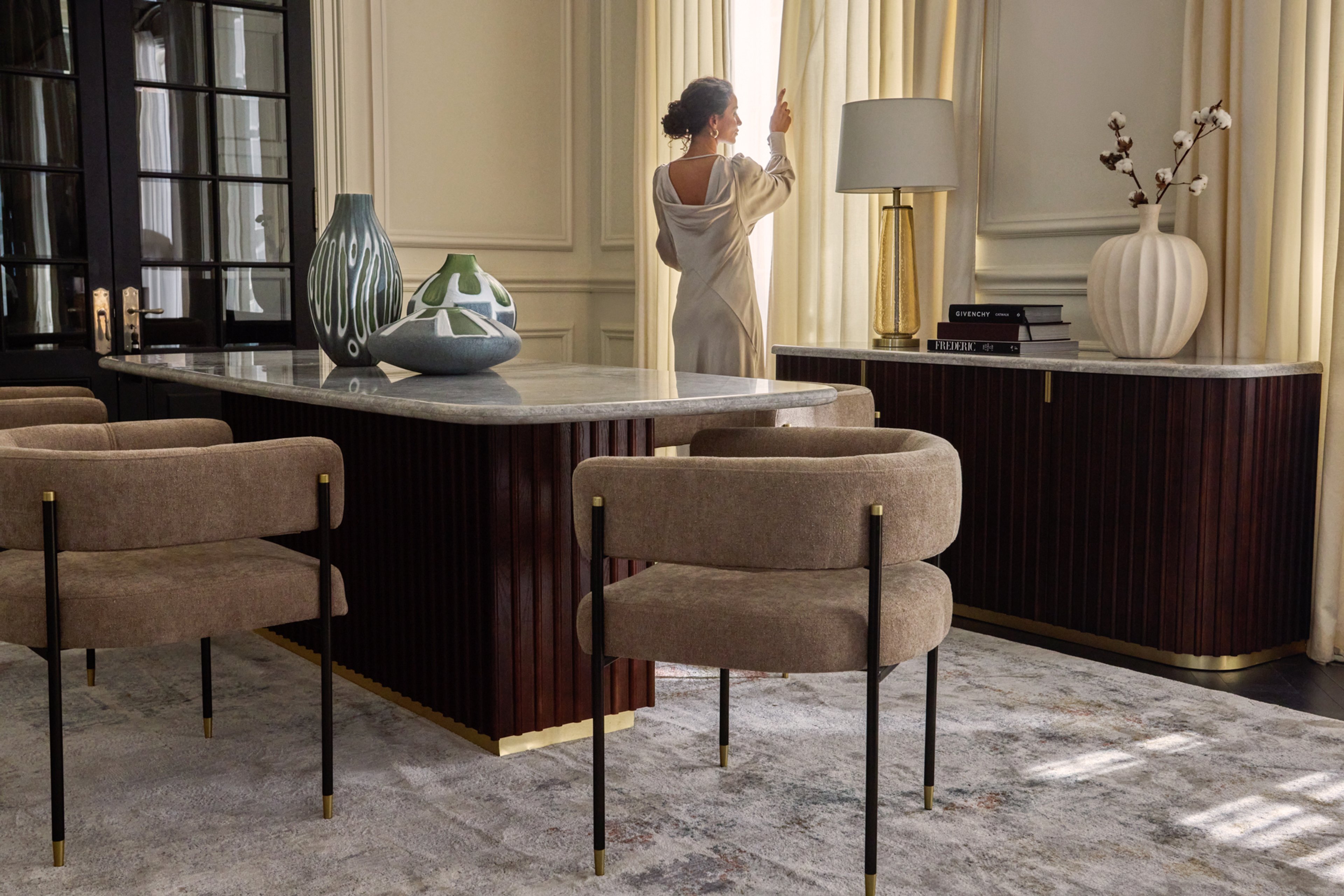 - Pair it with plush dining chairs. Or something with a curved silhouette can soften the setting.