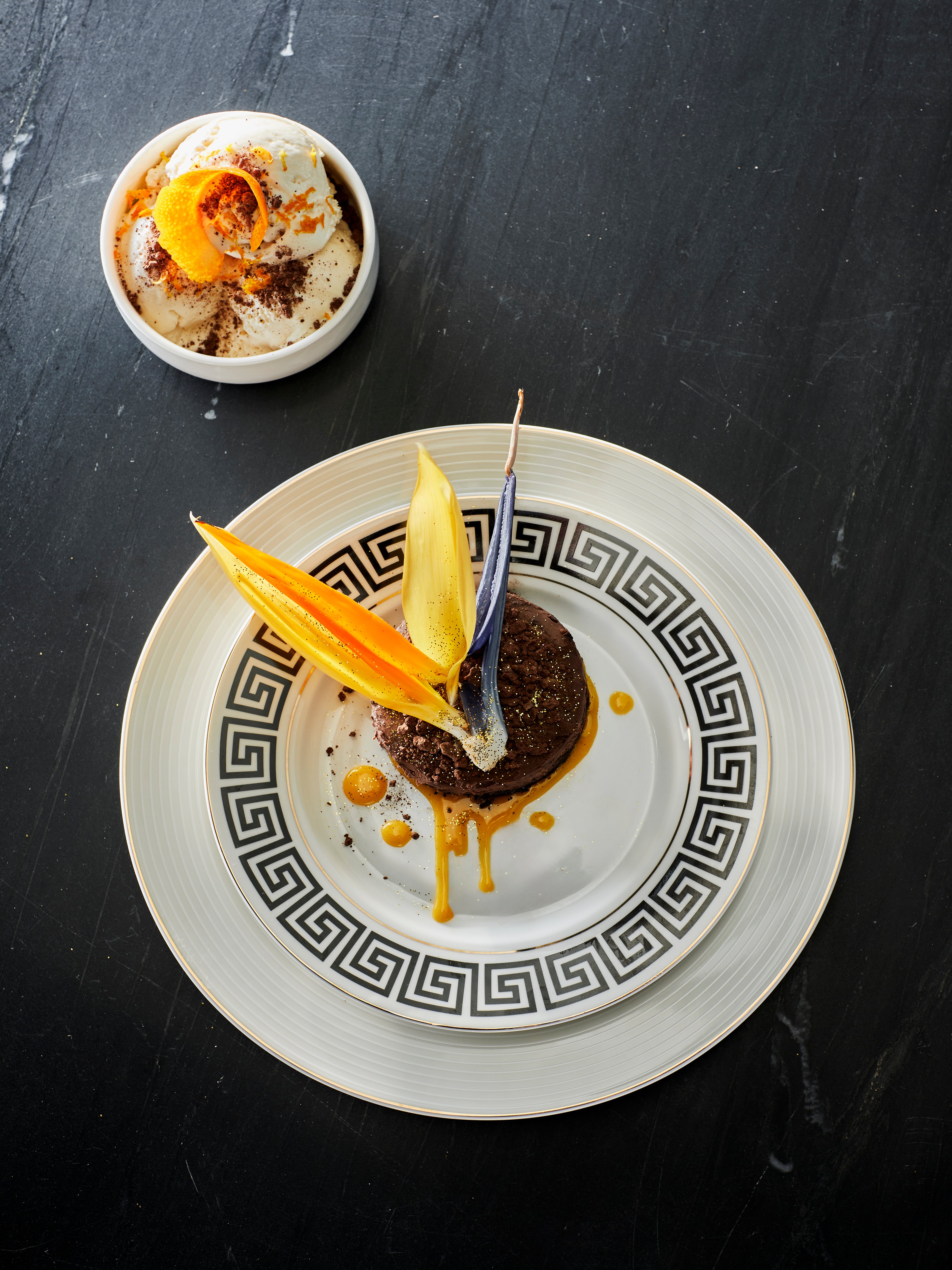 Using a rocher spoon, or use two dessert spoons if you don’t have one, make a beautiful rocher with the ice cream and place it on top of the chocolate soil in the side dish.