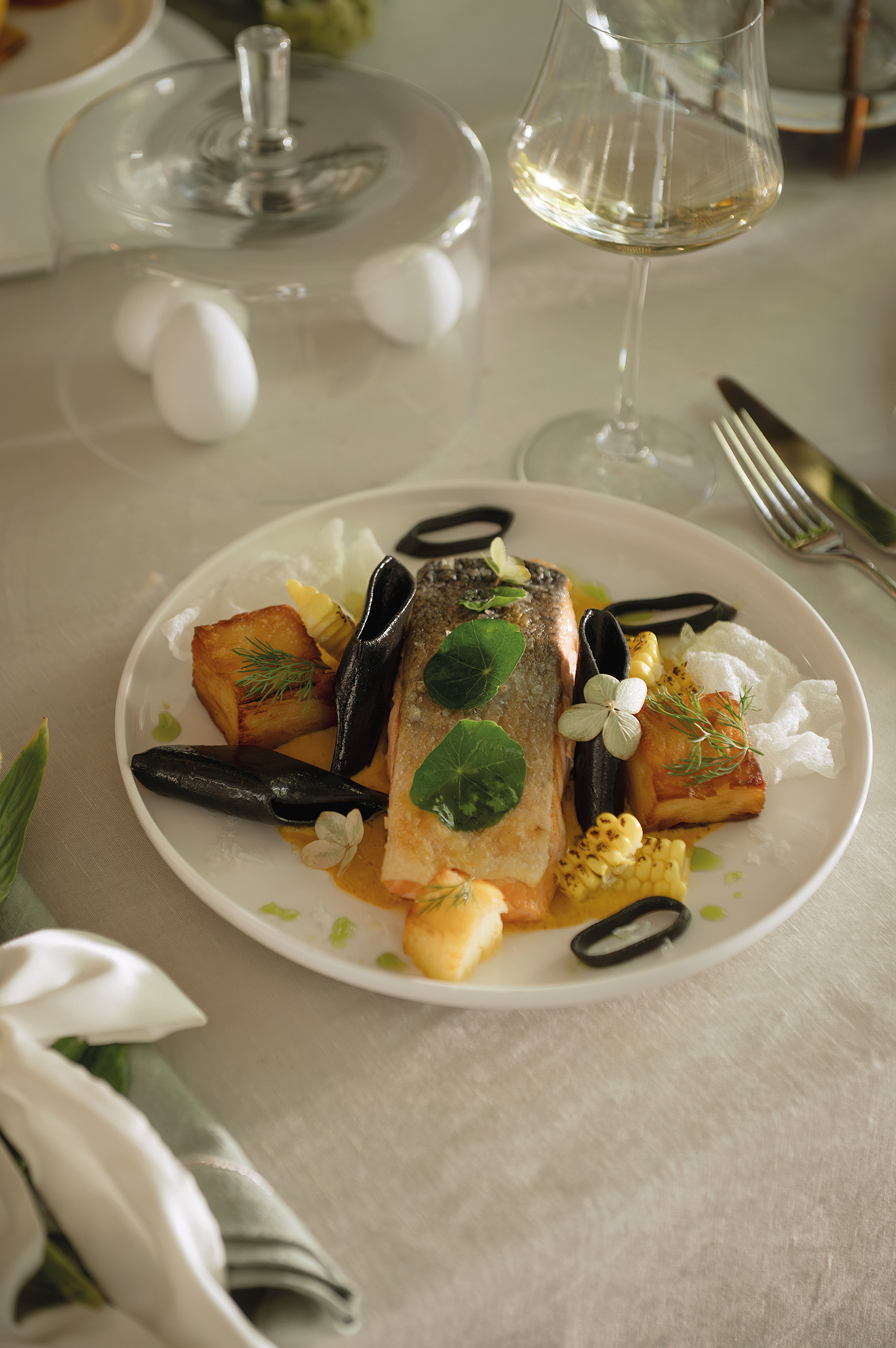 To serve, place on a plate skin side UP. Do not pour sauce on the skin until just before serving else it will soften the fish skin.