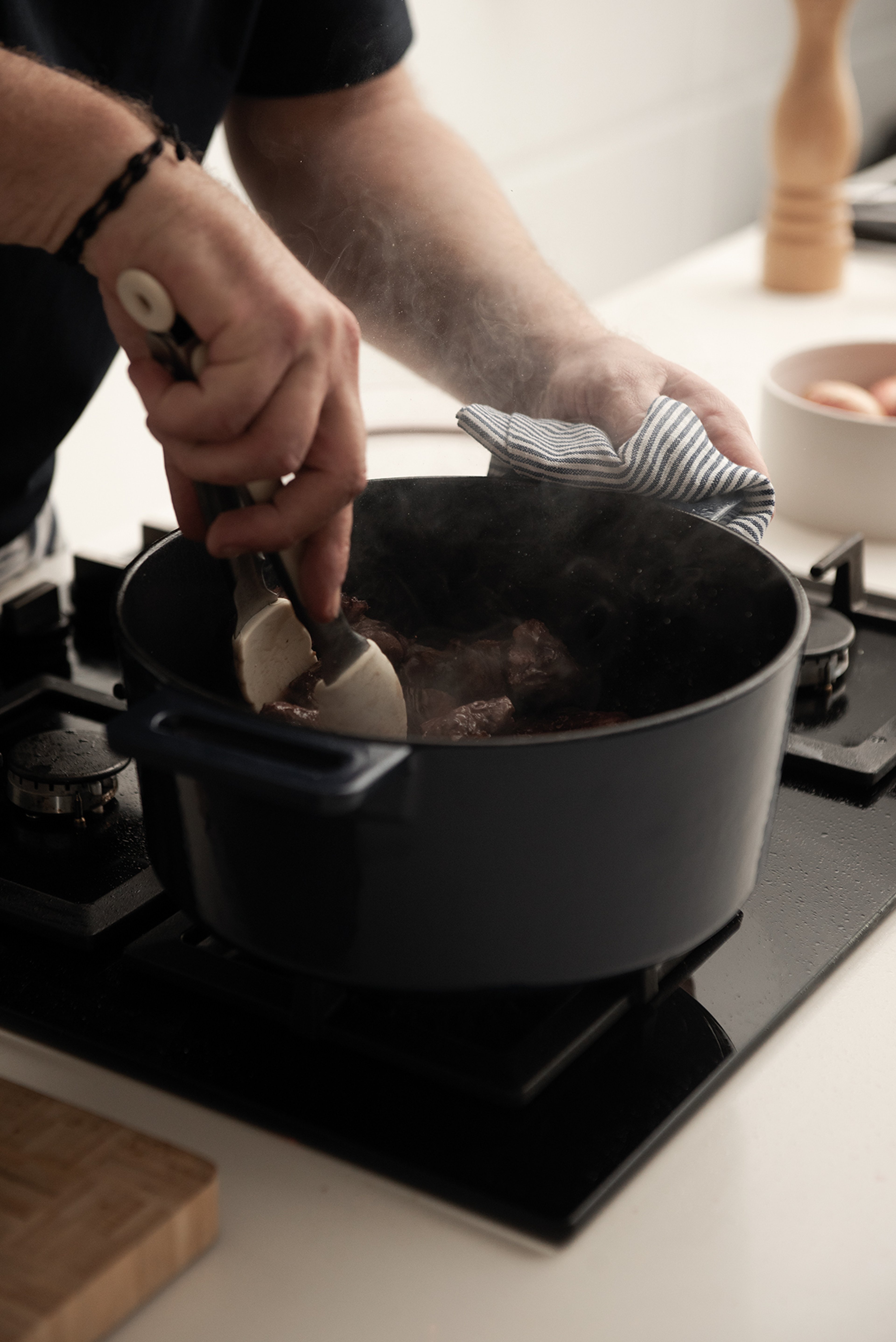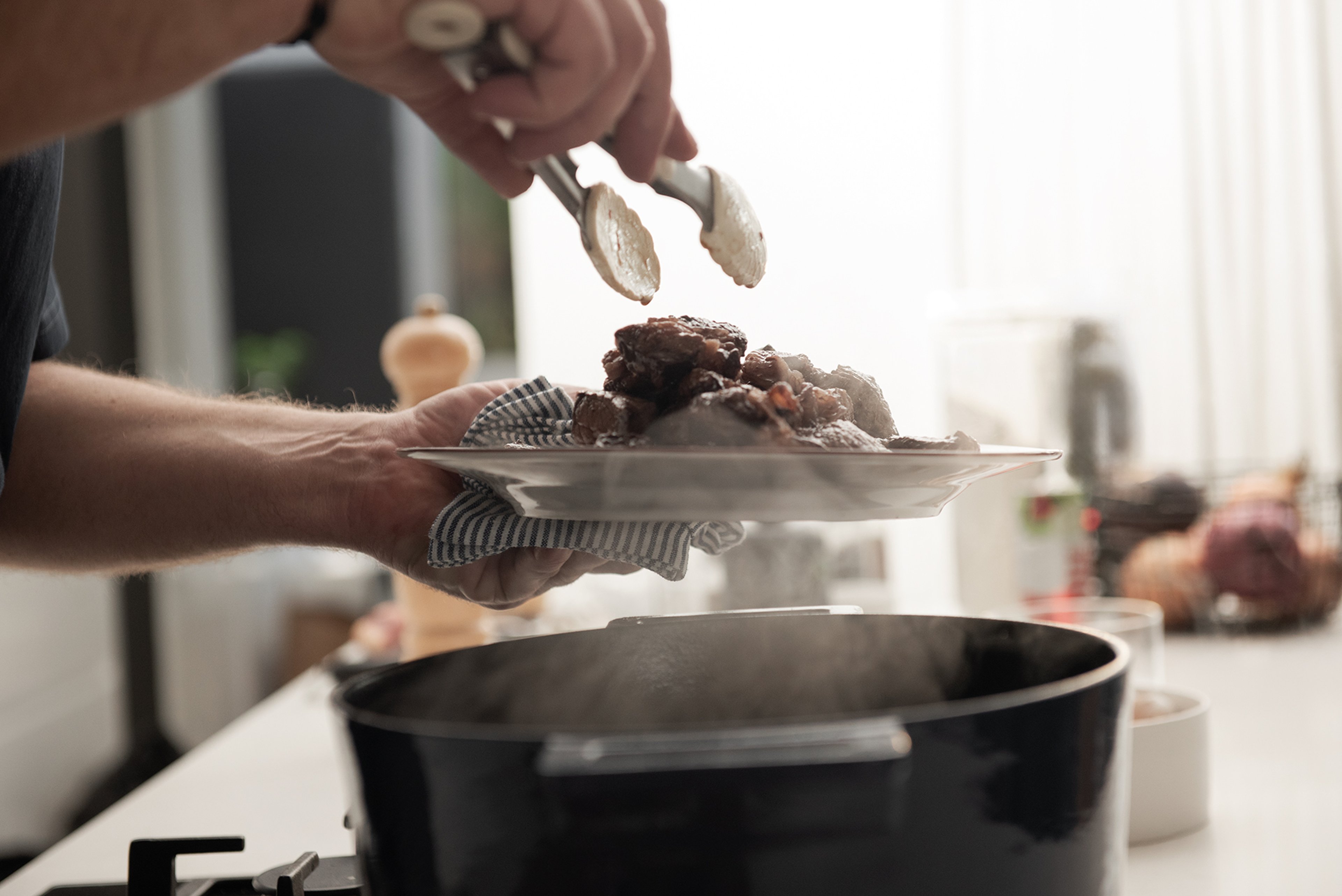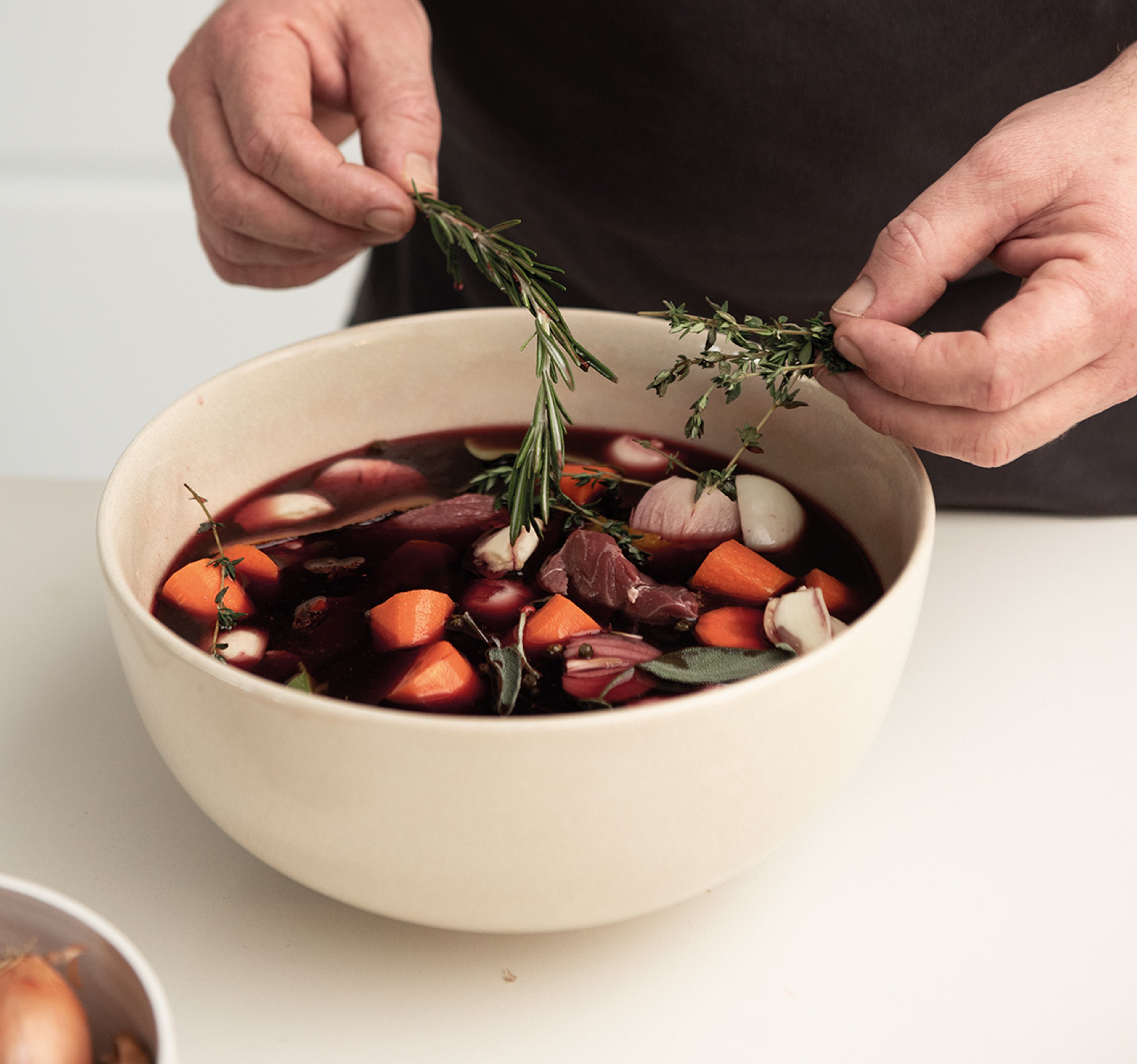 Decant the meat from the red wine keeping the aromatic garnish on one side as well as the wine.