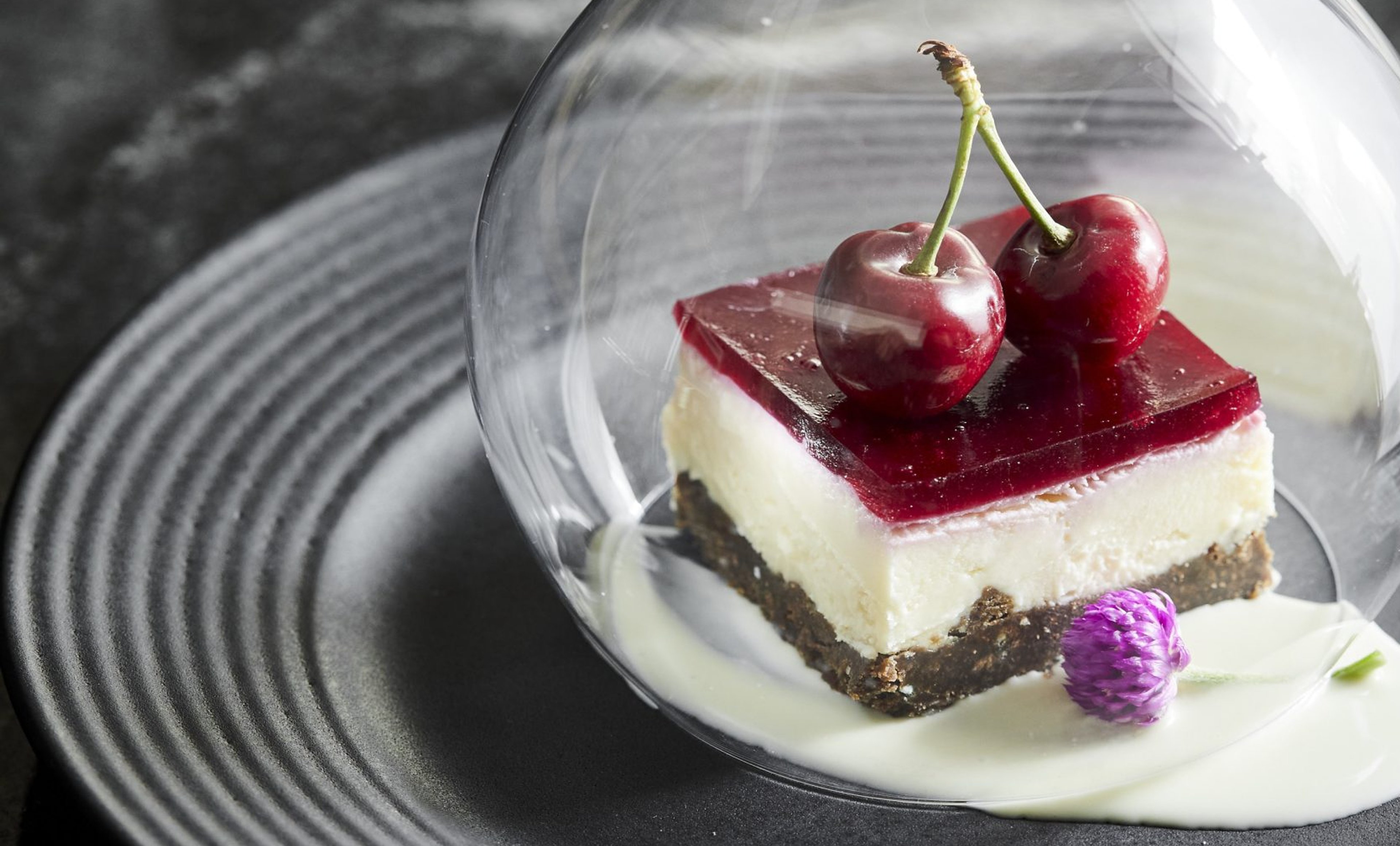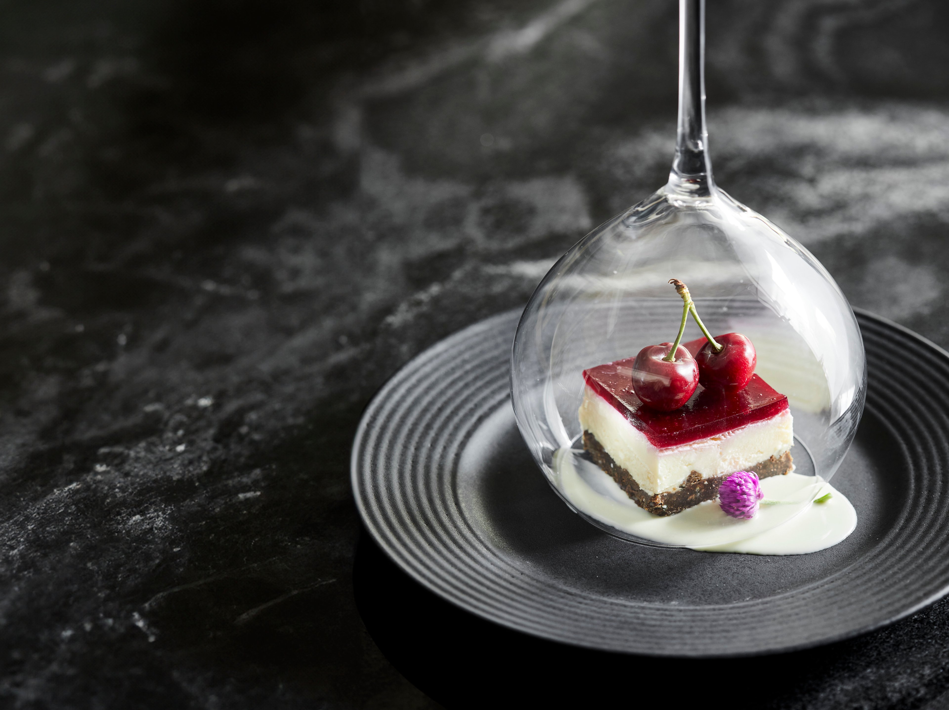 Place a piece of cheesecake in the centre of the plate. Top it with chopped pistachio and edible flower petals. Place the wine glass on top, and serve.