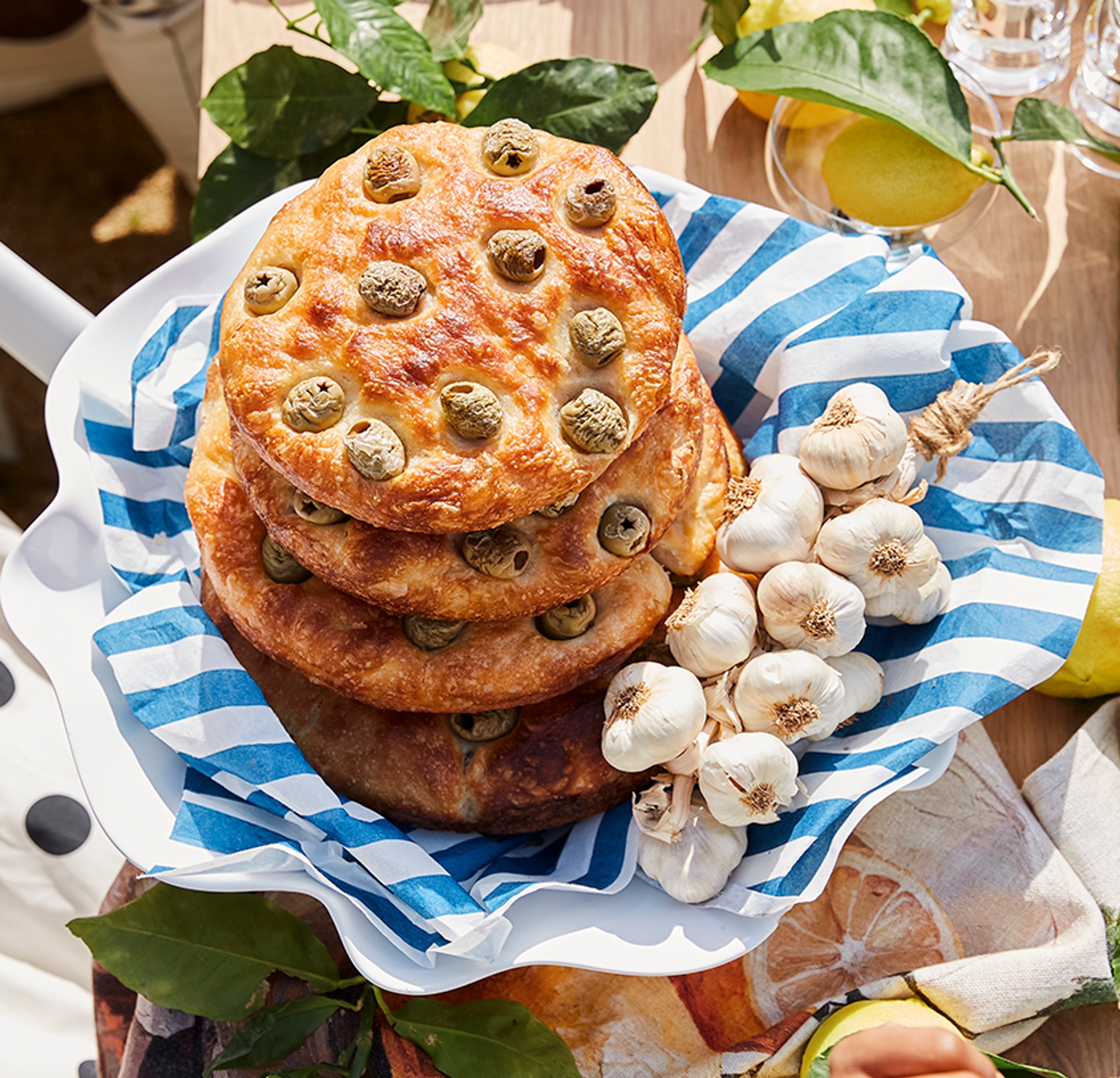 Press fingertips into dough to create dimples, drizzle olive oil, and stud each focaccia with green olives and sprinkle with salt.